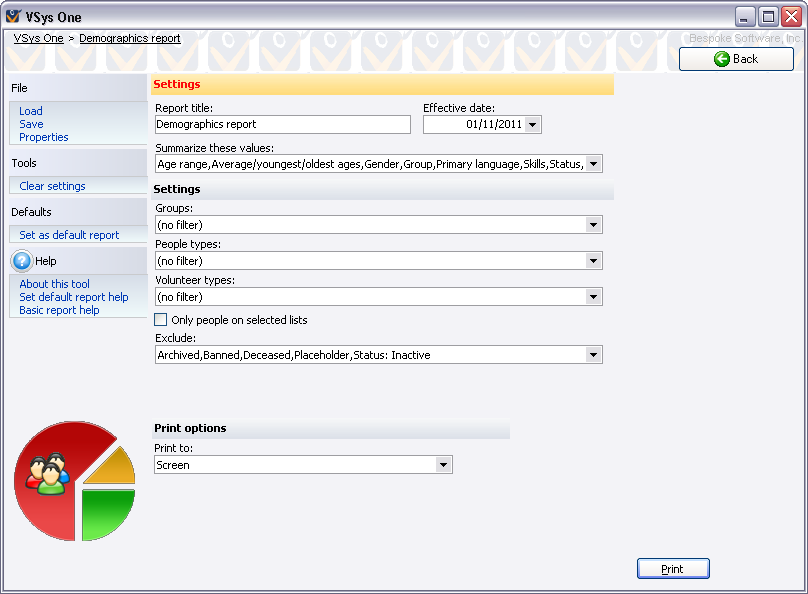 Demographics reports summarize all of your people based on various properties like gender, group, status, type and custom fields.