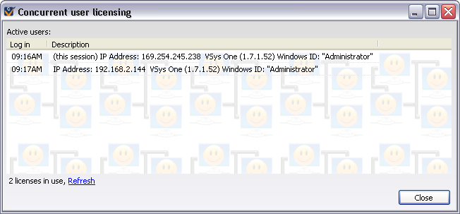 VSys provides a dynamic listing of the people currently using the program. This tool is usually very accurate. VSys uses database record locks or semaphores to check the status of each user, so a crashed or disconnected machine's license will be released within a few minutes of the machine's disconnection from the database, even if it was not a controlled shutdown.