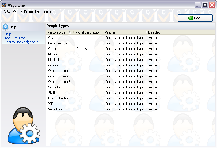 VSys comes with a list of 12 built-in types of people. You can't add new ones here, but you can disable or change the names of existing ones to suit your needs.