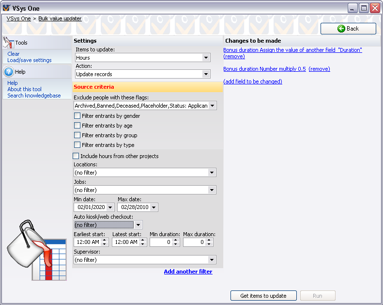 In this example, all volunteers who work "Emergency" jobs will get 50% of those worked hours as bonus hours. VSys lets you do this using the Bulk Value Updater in the User tools panel. (Note that bonus hours can be automatically calculated using Bonus hours crediting rules, we're just using this as an easy-to-understand example.)