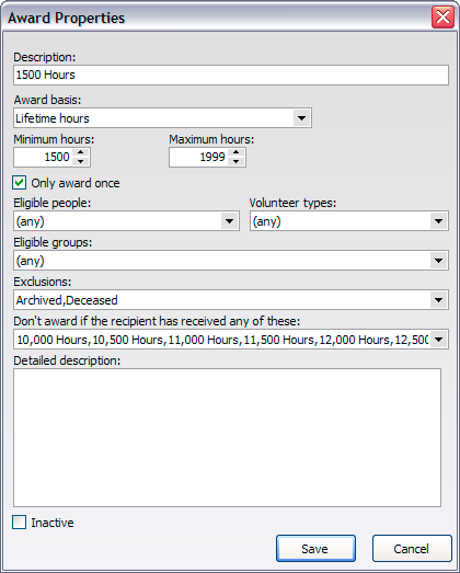 These are the simplest types of awards. VSys will not automatically nominate anyone for them, they must be manually nominated based on your own criteria. Example: "Most Friendly Volunteer". |