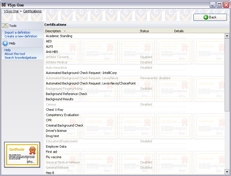 Deletes this certification's definition. Not available for any of the built-in definitions, and VSys will not let you delete the definition of a certification if anyone has that certification. |