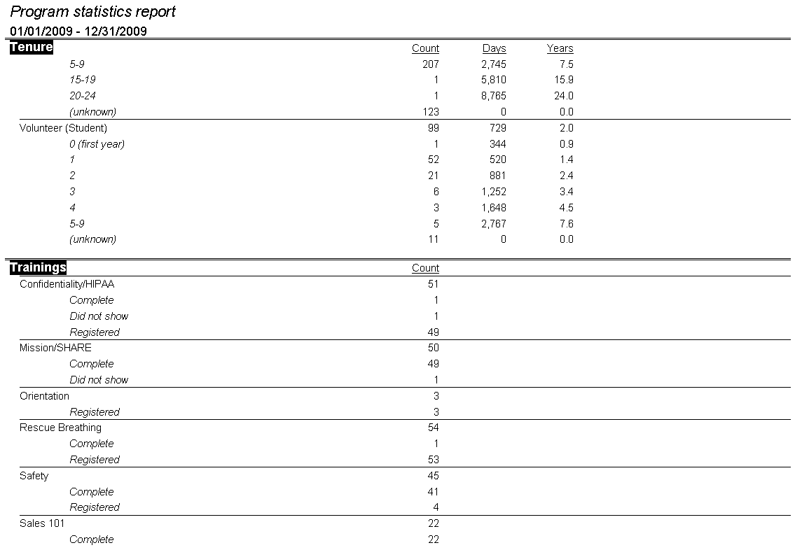 Unlike older versions of this report, the Program Statistics Report in version 1.7+ "steps back in time". That is, where transitions records are recorded, VSys attempts to determine what each person's status was at the end of the reporting period. This means that an inactive staff member now (31 January 2011) who was an active volunteer in December of 2009 will report as an active volunteer when the report is run with an end date of 31 December 2009.