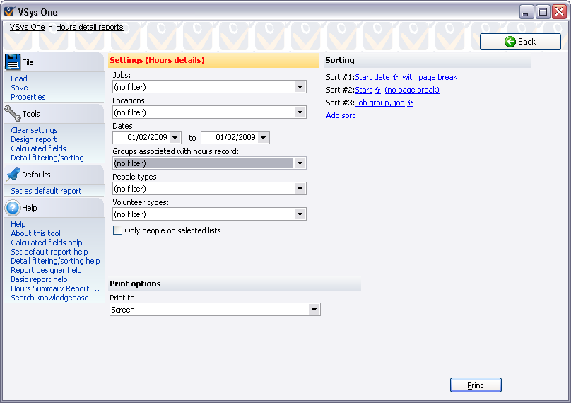 Hours details reports print every hours record which meet your criteria, grouped in an order you set, rather than broken up specifically by volunteer.