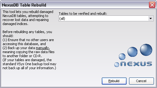 NexusDB is unlike SQL Server and Oracle in that it can be used in single-user standalone mode, with VSys writing directly to the database tables itself. Even when using NexusDB Server, NexusDB tables are more prone to file damage than those used by SQL Server and Oracle. This tool provides a mechanism for verifying and repairing possibly damaged tables.