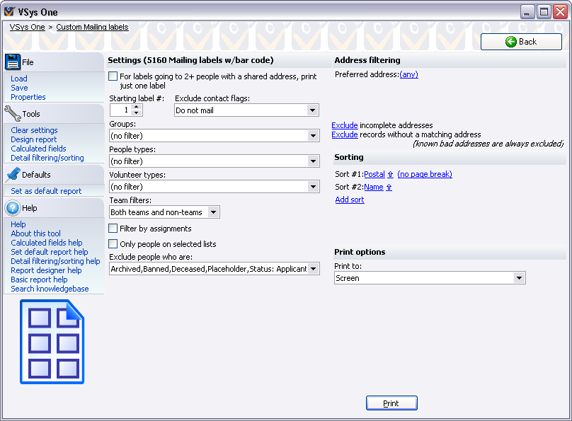 If checked, and two or more people sharing an address are included here, only one label will be printed for all of the people sharing that address. |