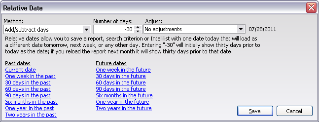 If we saved the report with these dates, 05/01/2009 and 05/31/2009, when we open them August, the report will still have those dates in it. If instead we used relative dates, in the example below to add/subtract days "-30" in the first field and add/subtract days "0" in the second, when we open the report on August 10th, it will show with dates relative to the current date. Note: date fields which hold relative dates show in pink to differentiate them from fixed dates.