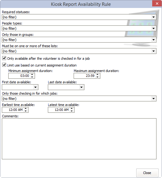 Right-click in this list to create one or more availability rules for the report. At least one of these rules must be met for the report to be made available to the volunteer on the kiosk. A report with no rules is available to everyone. |