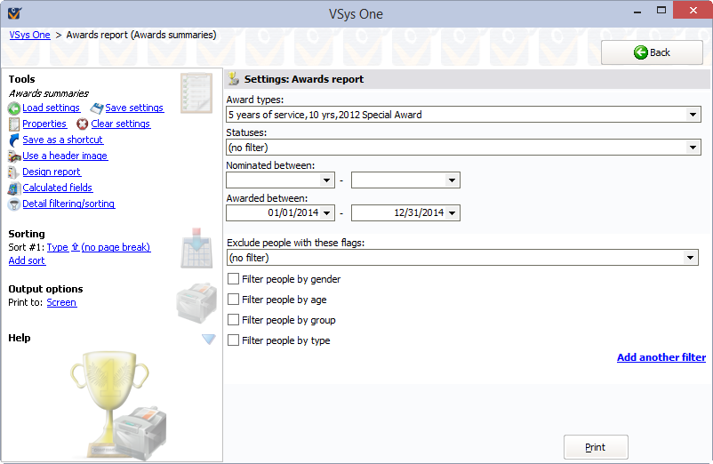 3. On the Settings panel, choose any filters for award types, statuses, nomination and award dates.
