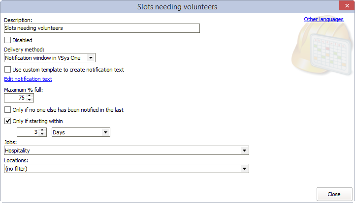 In this example, with this event, a notification will only be generated if the slot has less than 75% of its required volunteers, is starting within 3 days from now and is in the job Hospitality.