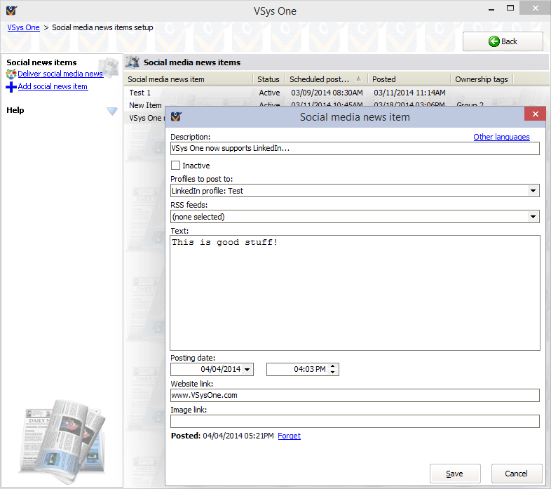 News items for social media delivery do not directly support formatting and are posted only when VSys is told to do so by clicking on Deliver social media news or using a scheduled task. (Some social media sites support certain HTML tags in postings. You'll have to manually enter that formatting here for VSys to include it.)