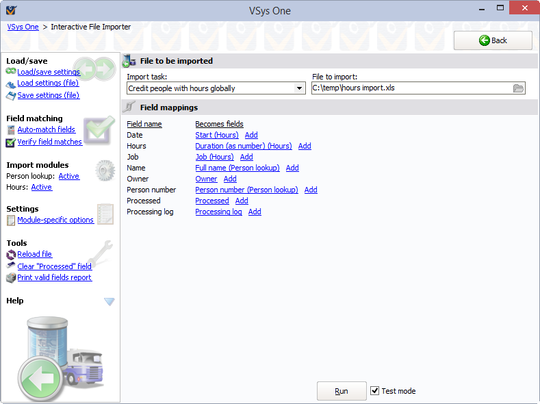 Start by determining the type of information you want to import, and then select the most appropriate task above. To see what fields are available, click on the Print valid fields report link. This gives you, grouped by module, a listing of what fields can be imported. Note that you can import the same file more than once in order to process bits of data which can’t be imported in one pass.