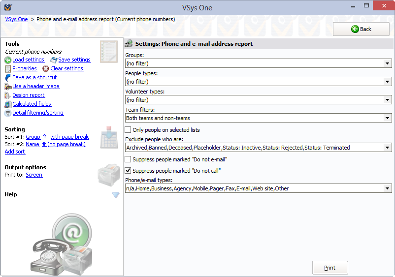 From the VSys One home screen, go to the Reports panel and click on the Phone and e-mail address link.