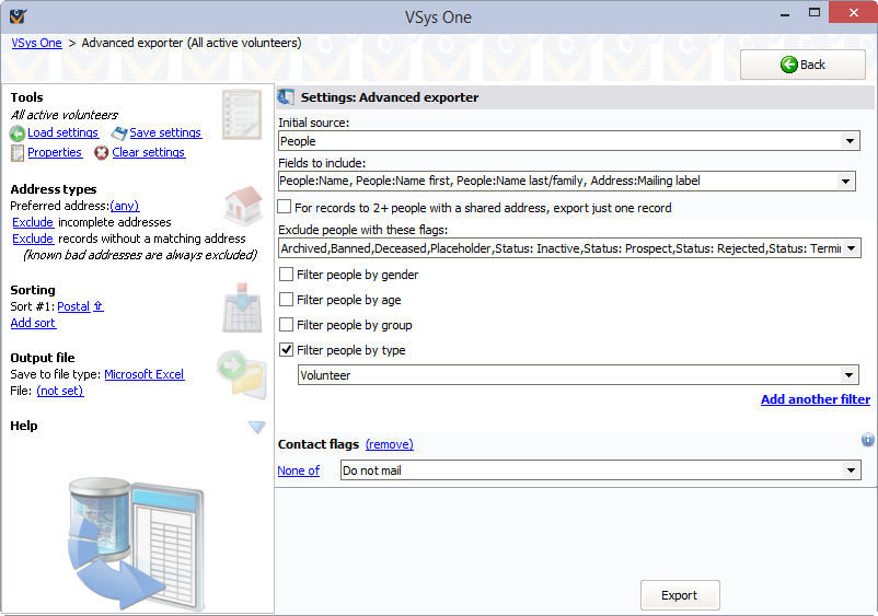 You can add any other types of filters by using the Add another filter link. There are over 30 filter options there, and VSys will only include a record in the export if it meets all of the filters you set above plus any of these.