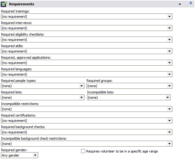 VSys will only let you assign someone to this job if he has all of the skills checked here. Be careful here not to be so specific that you limit your pool of eligible volunteers. |
