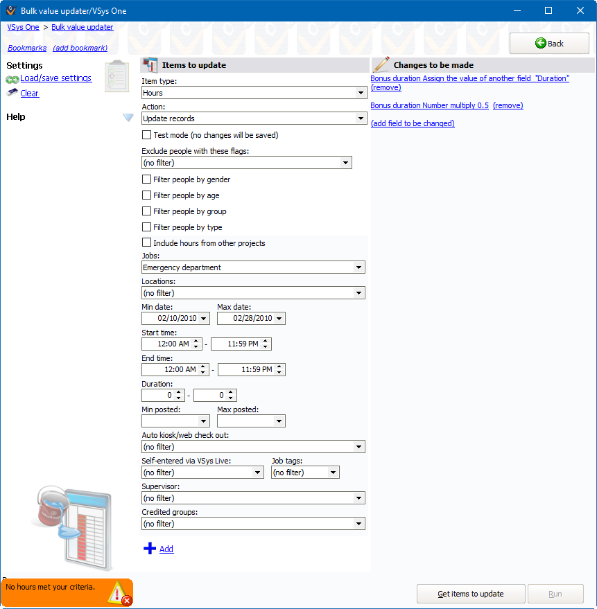 In this example, all volunteers who work "Emergency" jobs in February will get 50% of those worked hours as bonus hours. VSys lets you do this using the Bulk value updater. (Note that bonus hours can be automatically calculated using Bonus hours crediting rules, we're just using this as an easy-to-understand example.)