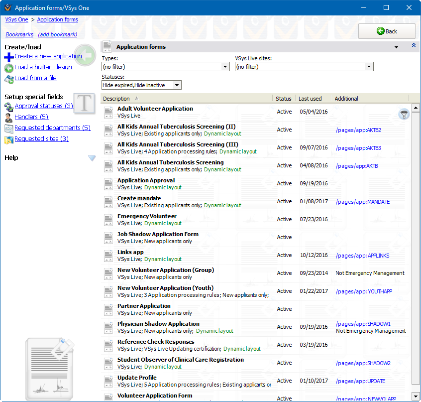 From the VSys One home screen, on the Setup panel, click Application forms.