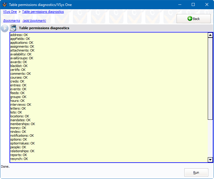 The Table Permissions Diagnostics tool verifies that for each VSys One table in your database, VSys can perform all of the required operations for normal use. When run, VSys will perform a SELECT, INSERT, UPDATE and DELETE operation on every table and log any errors that it encounters.
