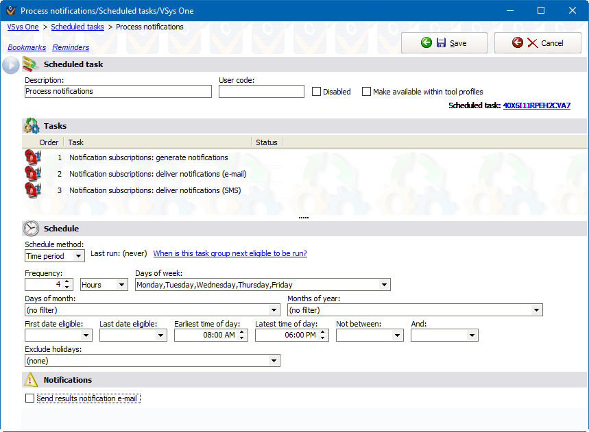 After running a task group, VSys can optionally send a message (notification) to one or more people about the results of the processing. If that task group included a mail merge, and if that task's settings had it send a summary of the generated letters, it will send that summary to these same people.