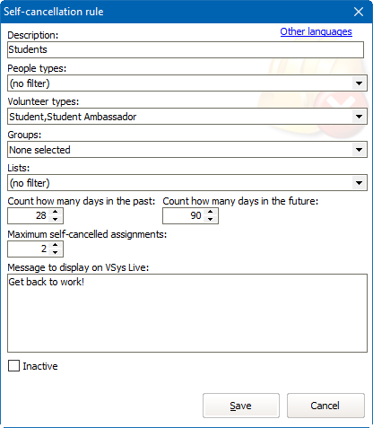 If a person meets the criteria of the rule (People types, Volunteer types, Groups, Lists), VSys Live counts the number of assignments for this person with the status of "Cancelled by volunteer" or "Volunteer requests replacement" based on the Count... fields here. If the volunteer has at least the Maximum self-cancelled assignments within that window, VSys Live will show your Message... rather than letting the volunteer cancel the assignment.