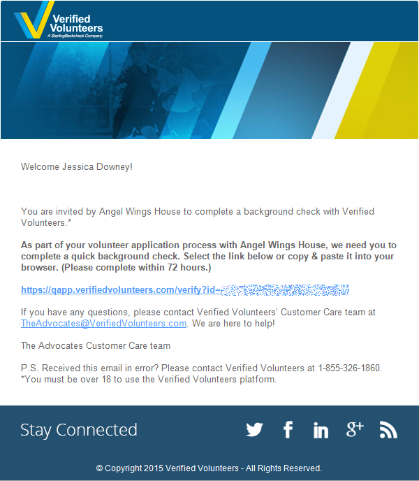 Once a background check request has been sent to Verified Volunteers by VSys One, Verified Volunteers takes over the process. The volunteer will be automatically e-mailed by Verified Volunteers and walked through the screening process.