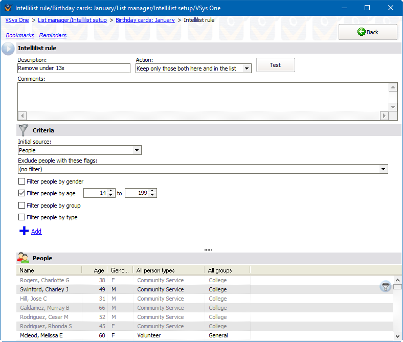 Every Intellilist requires one or more criteria to designate the rules for deciding whether or not a person belongs on the list. Whenever VSys needs to determine who's on the list, it checks people against these criteria, and those who meet all of them are considered to be on the list.