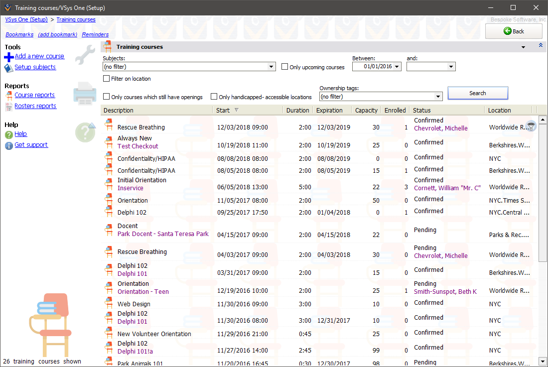 By default, all upcoming courses show on this list. Use the filters at the top to change those criteria and list past courses, those within a specific date range, by subject, handicapped accessibility, location or whether the course still has openings for more students.