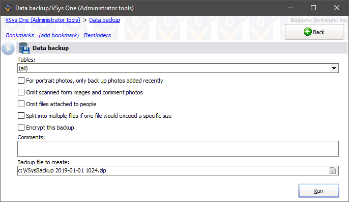 2. To begin the backup process, click the Run button. VSys will indicate its progress as it backs up individual tables.