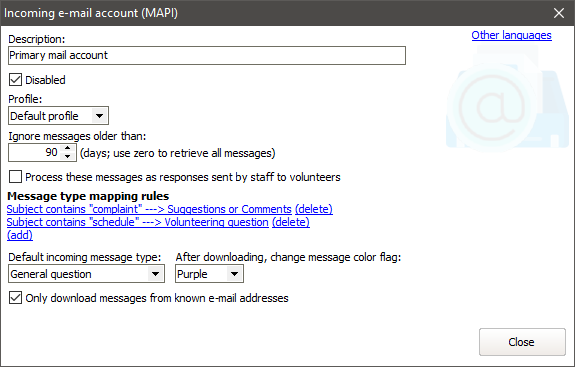 VSys can automatically retrieve incoming e-mails from your volunteers by querying your mail server, then produce incoming messages based on those e-mails. Each incoming e-mail setting is used to retrieve mail from a single account on a single mail server. You can use multiple incoming e-mail settings to have VSys retrieve mail from multiple accounts on multiple servers. Each setting also includes a filter mechanism so that you can classify messages by subject and/or recipient e-mail address.