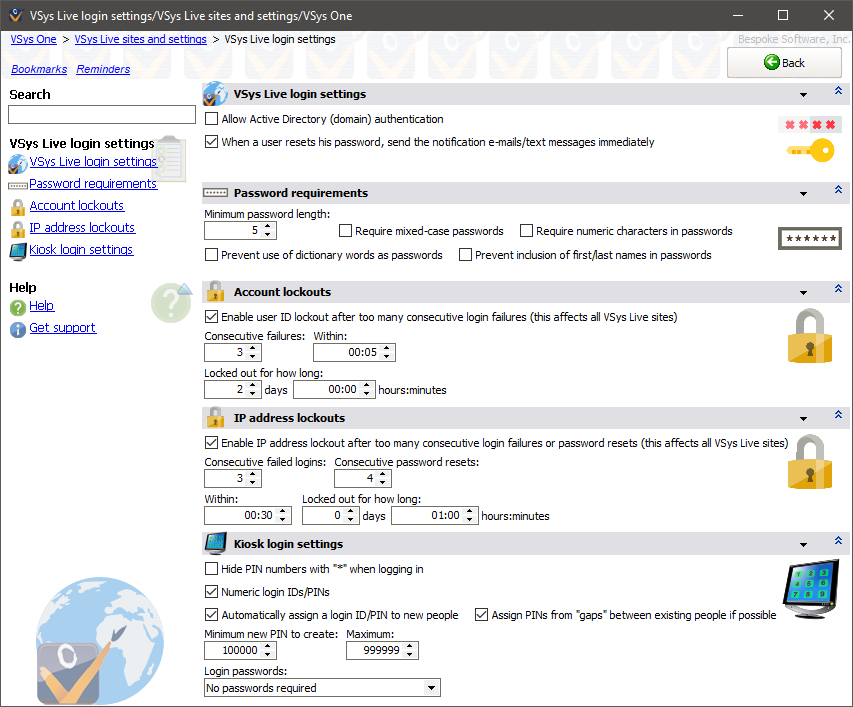 These correspond to the login settings in VSys Kiosk setup. Changes to these also affect the regular VSys Kiosk.
