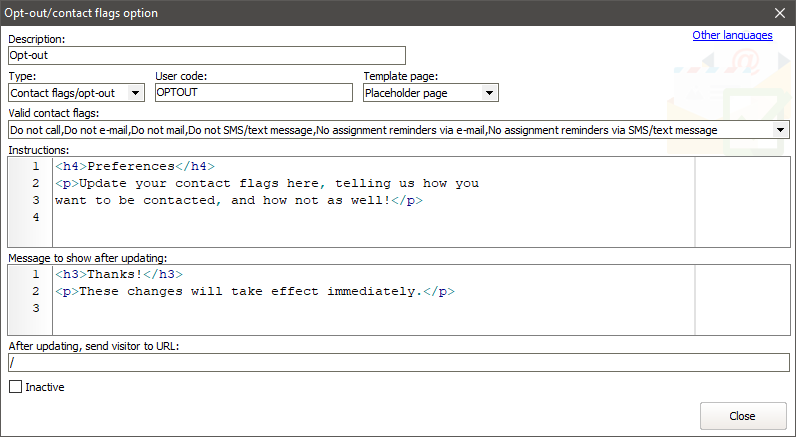 The code you set here will be part of the link placed in your letters. In this example, the link will be https://demo.VSysLive.com/pages/opt:OPTOUT (but with your VSys Live site's address).