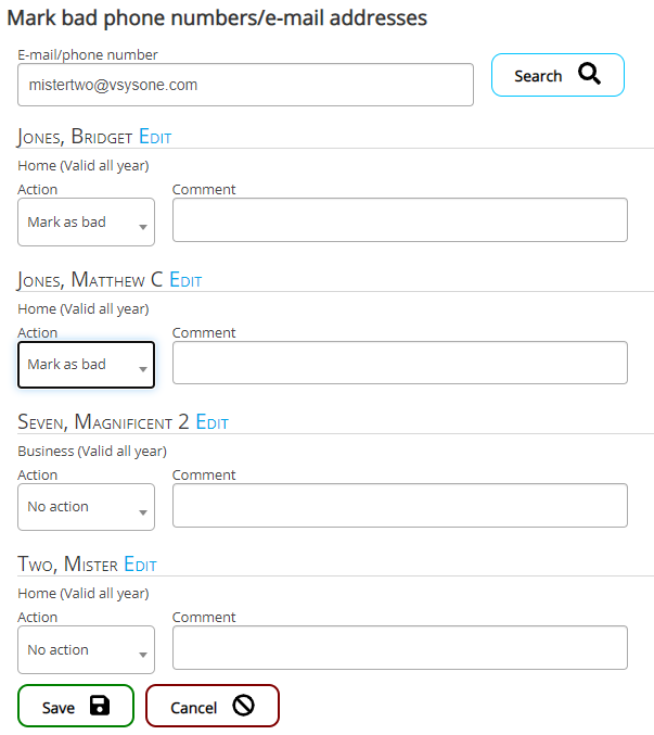 2. For each person brought up (if any), choose an Action: "Mark as bad" will mark that e-mail address or phone number as "Known bad" in their profile, then optionally add a comment to their profile. "No action" tells VSys to ignore this person, effectively saying that the e-mail address or phone number is fine for this person.