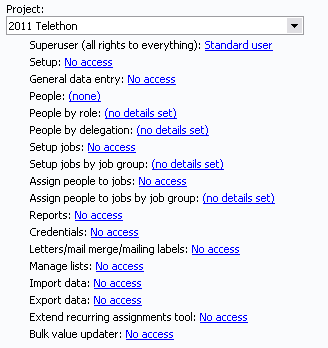 Users without global "Access to all" for projects can be given rights to individual projects and tasks in those projects. Select a project from the list. This brings up the user's rights to that specific project.